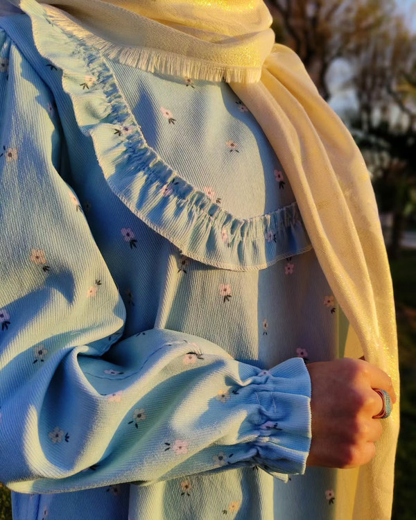 جنس پارچه خیلی لطیف و عالی هست دوخت فوق العاده تمیز و مزون دوز چین هاش که خیلی دلبره ، دور مچ ، روی سینه و پایین لباس چین داره. قد لباس متناسب با قد شما دوخته میشود.
